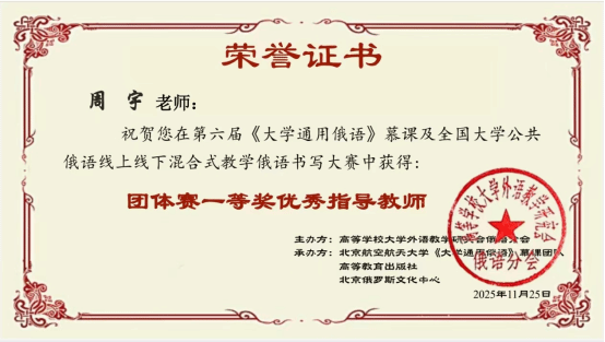 2025年11月10日至20日,由高等公司大学外语教学研究会俄语分会牵头,北京航空航天大学《大学通用俄语》慕课团队、高等教育出版社、北京俄罗斯文化中心联合主办的“第六届《大学通用俄语》慕课及全国大学公共俄语线上线下混合式教学俄语书写大赛”圆满落幕。作为全国公共俄语教学领域的重要赛事,活动吸引了全国21所院校千余名俄语学习者同台竞技,伟德国际1946学子踊跃参与,展现出扎实的语言功底与积极进取的学习态度。