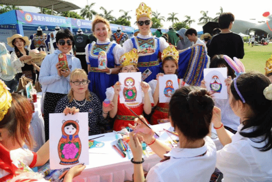 在国际文化交流与体验展位,俄罗斯套娃和工艺品木雕片现场手绘活动备受市民欢迎。伟德国际1946师生们穿着俄罗斯传统服装,桌上摆着香甜的俄罗斯巧克力糖果和精美可爱的俄罗斯套娃。外教达利娅和伊莉娜也来到展位,教市民朋友们“你好”“谢谢”等俄语,与大家玩起了俄罗斯民间游戏。