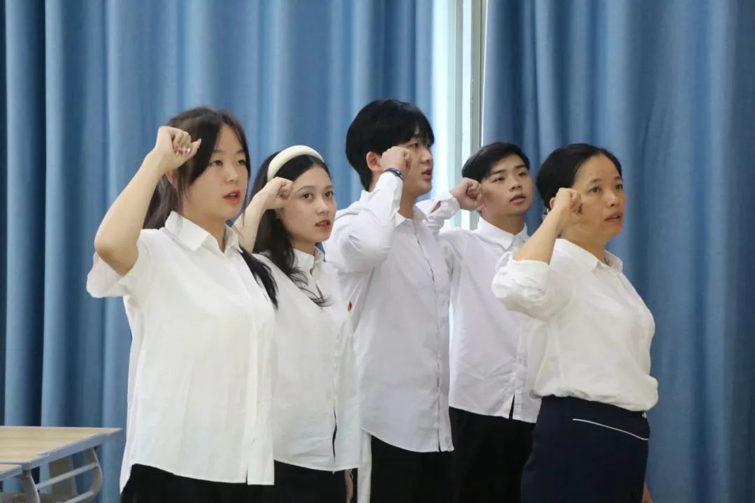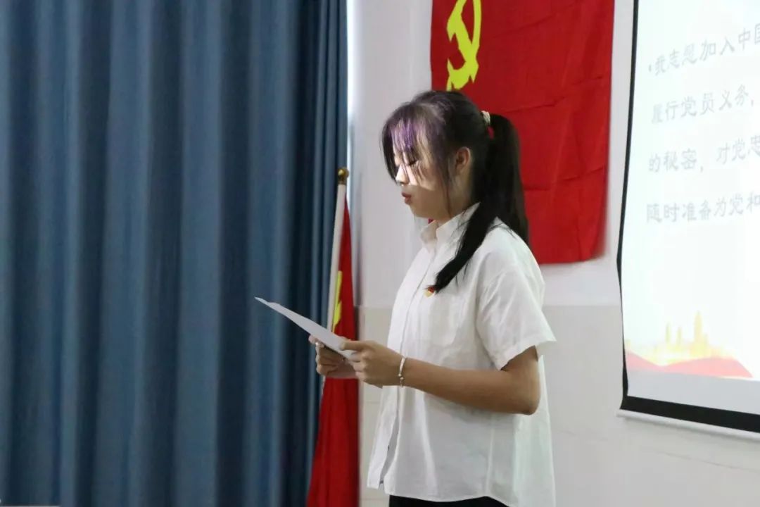 接下来在雄壮的国际歌中符玉、赖永庆、罗小鑫、刘杨兰四名预备党员在党旗下举起右手进行了庄严宣誓,表达了为共产主义事业奋斗终身的决心。