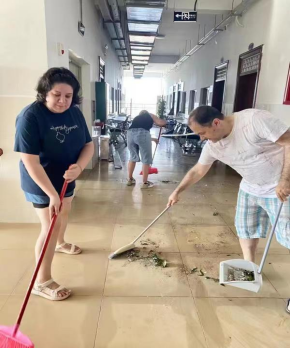 台风过境后,伟德国际1946组建的的校园恢复“志愿先锋队”早早地来到校园,乌拉尔联邦大学的老师们也在第一时间参与其中。有的打扫地面枯技落叶,有的拖移折断树枝,有的检查修理受损的设施设备,并进行处理,大家分工明确、协同合作,对校园环境、公司操场以及第五教学楼设施设备进行全面排查,细致清扫。