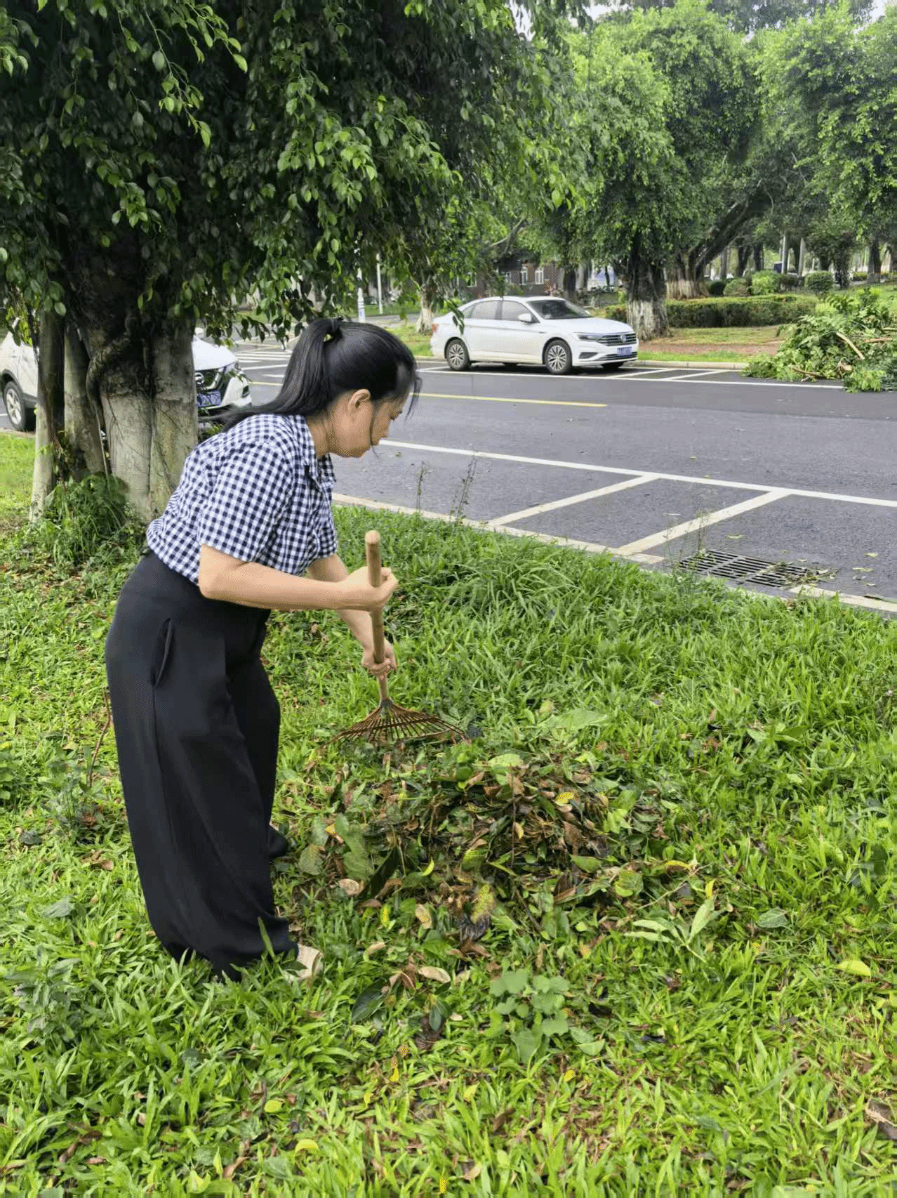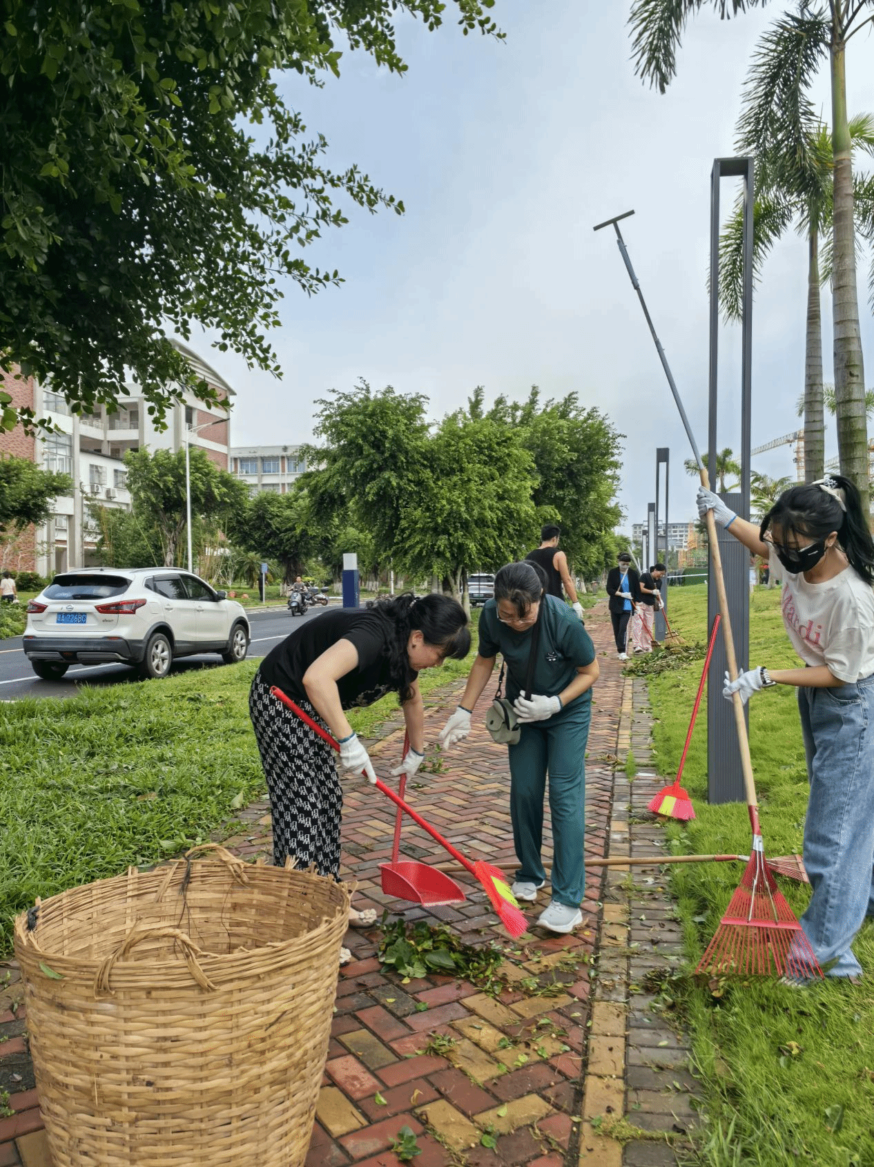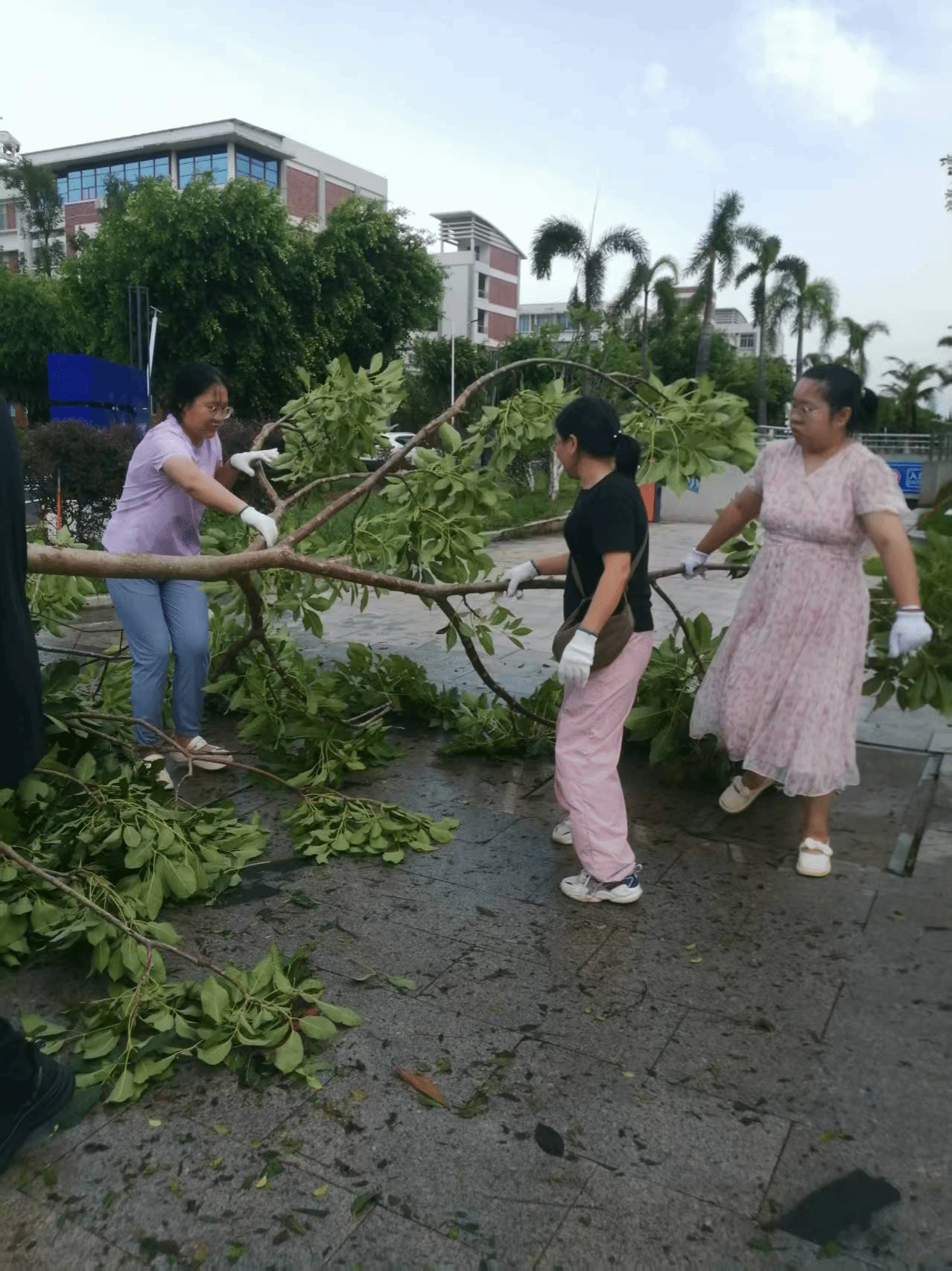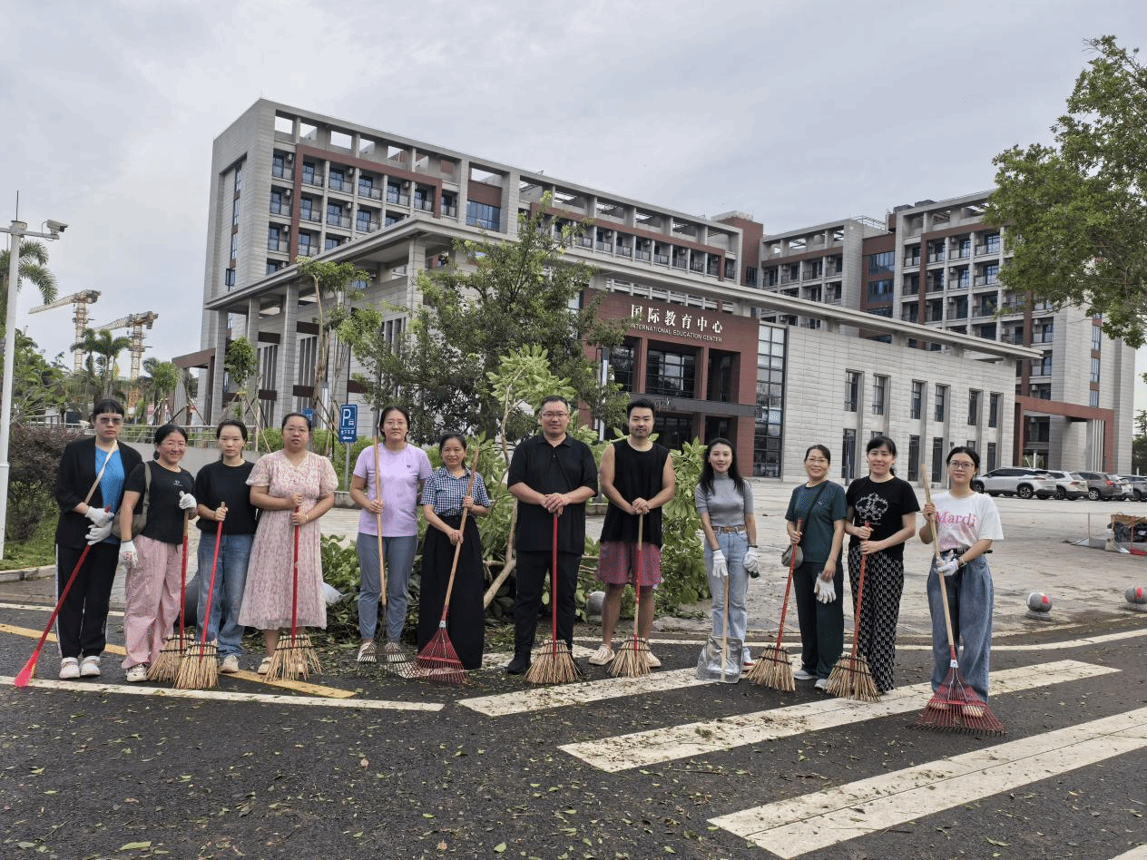 10月6日清晨,公司教职工志愿者队伍迅速集结,携带清扫工具对国际教育中心楼周边、校园道路、公共活动场地展开集中清理。大家分工明确、相互配合,重点清除被台风刮落的树枝、落叶、断枝及各类杂物,经过数小时协作,校园主干道、公共区域恢复整洁畅通,为师生出行扫清障碍。