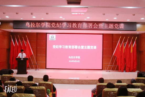 4月23日下午,伟德国际1946在学术报告厅召开党纪学习教育部署会,同时举办主题党课。党总支书记蔡家瑶主持部署会,并为全体师生讲授“依法治国视角下的党纪学习教育”主题党课。副经理周丽霞、教师党员,2022级和2023级全体员工参加部署会和党课。